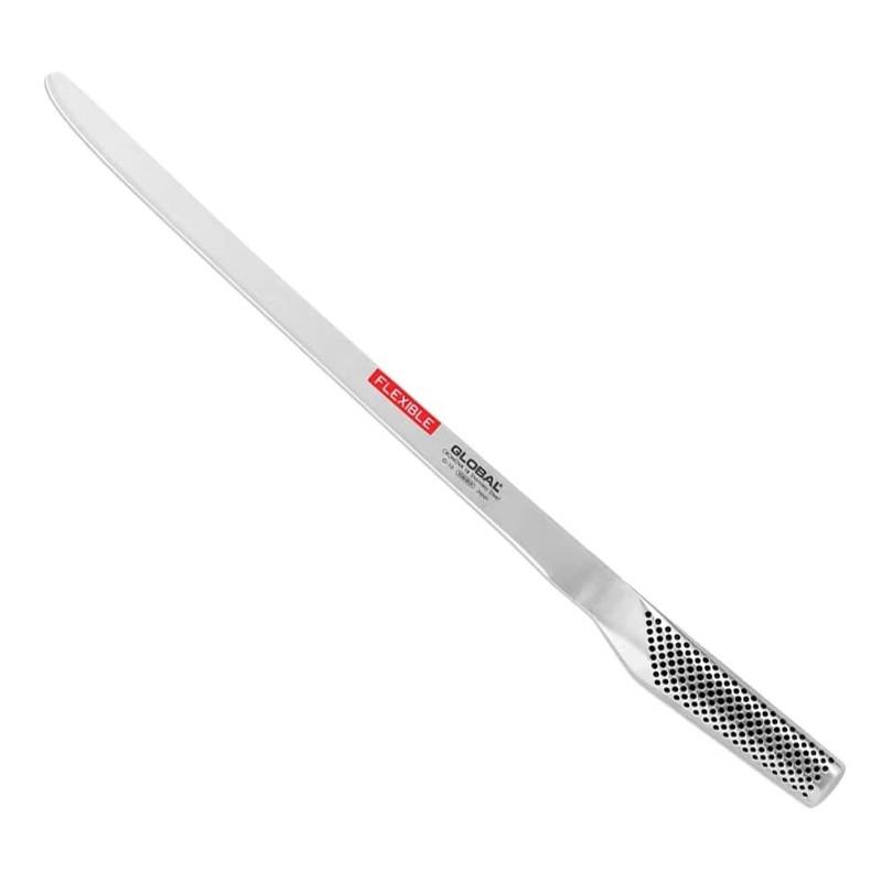 El mango, construido en una sola pieza, como todos los cuchillos global, hace que tenga un agarre sólido que te permite hacer cortes finísimos. La hoja es alveolada para evitar que se pegue el jamón, o el salmón puesto que este cuchillo también podría ser un salmonero. Y por último su filo inigualable hace que sea una apuesta segura para los cortadores más exigentes.